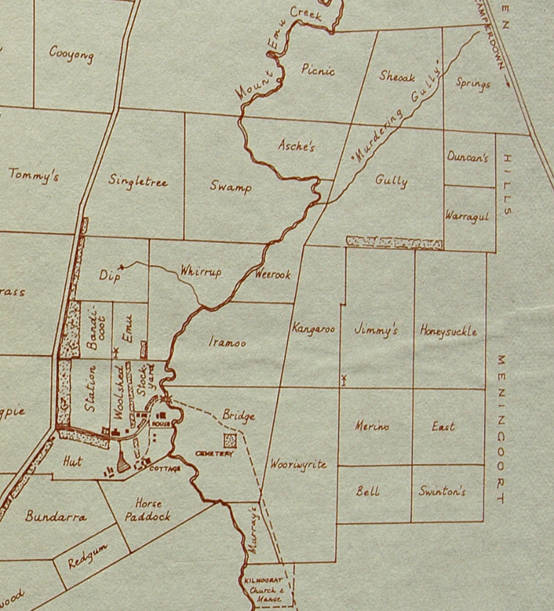 Location of the Murdering Gully massacre on Mount Emu Creek 1839.