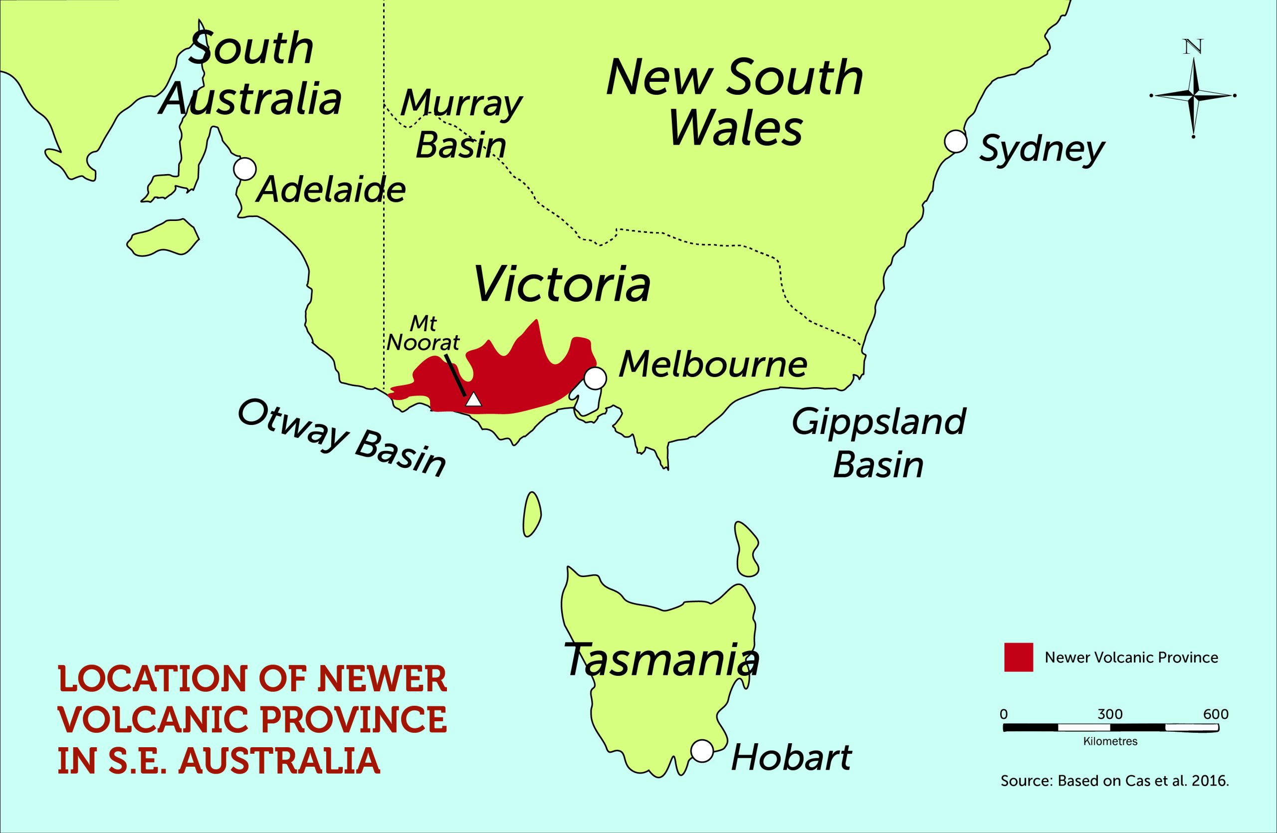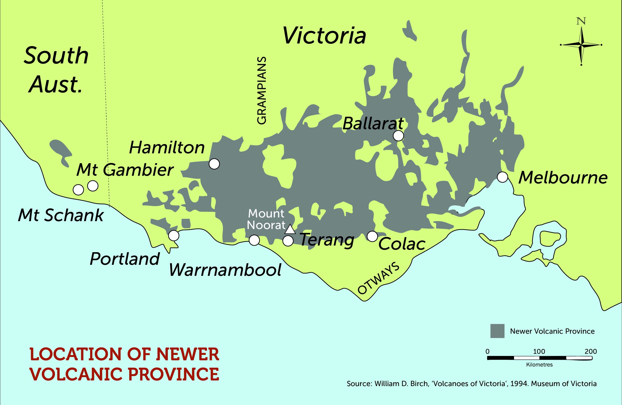 Mount Noorat is a significant feature of the Victorian Volcanic Plains (VVP). The VVP is the western part of the Newer Volcanics Province (NVP), a widespread field of over 4301 volcanoes extending across Victoria from Melbourne to the west of Mt Gambier in the SE of South Australia (see visuals to right and below).The Newer Volcanics Province is the name given to the region that displays the products of volcanism of mainly the last five million years …. but importantly also of volcanic activity as recent as approximately 5,000 years ago. With an average time between eruptions of 10-20,000 years it is still regarded as an active region. At 23,000 km2, the NVP is one of the largest volcanic provinces of its type in the world